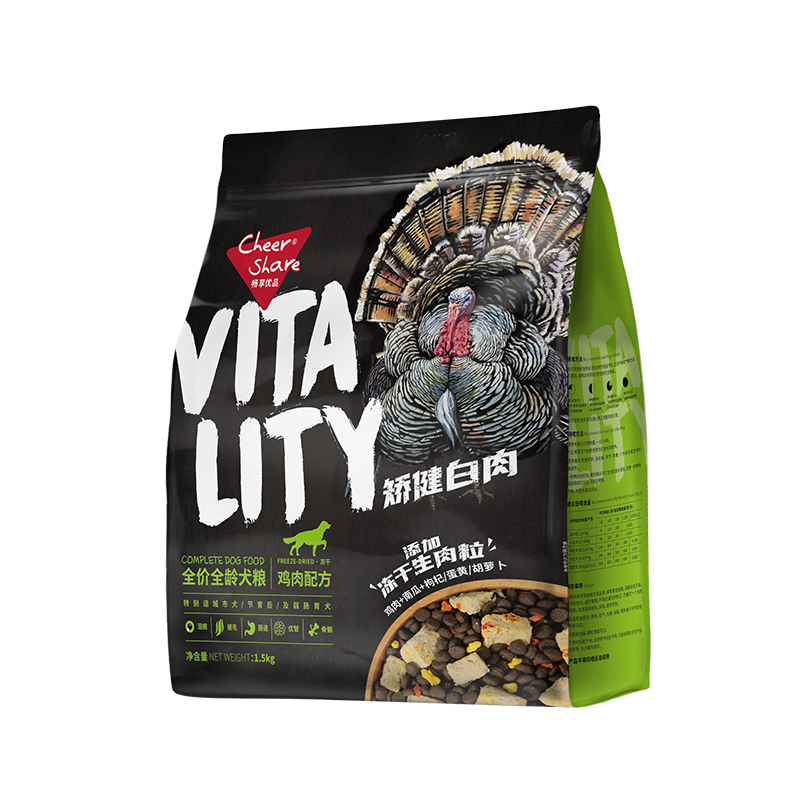 脱水鸡肉(28.6%),马铃薯淀粉,木薯淀粉,脱水鯷鱼(8.8%),鸭油,冷冻鸡肉(5.1%),红薯干,脱水牛肉(4.1%),水解三文鱼,鸡肝粉,水解蛋白,啤酒酵母粉,喷雾干燥鸭血球蛋白,海藻粉,甜菜粕,胡萝卜冻干(0.27%),蛋黄冻干(0.26%),南瓜(0.21%),枸杞子(0.17%),桑葚(0.16%),蒙脱石粉,南瓜子粉,牛油果(0.09%),万寿菊干花(0.08%),鱼肝油,牛奶粉,丝兰